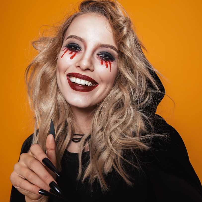 Un clásico de Halloween que nunca pasa de moda es el maquillaje de vampira. Este look es elegante y dramático, con un toque de horror. 🩸 El enfoque está en la mirada, con un smokey eye negro y rojo que crea una profundidad intensa. 👁️ La parte más llamativa son las “lágrimas” de sangre que corren desde la esquina de los ojos, hechas con un labial líquido rojo o pintura facial. La piel pálida y los labios en un tono vino oscuro o negro completan el look de manera fatalmente encantadora. 🦇